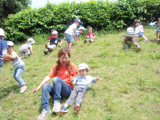 親子で岸根公園へ遠足に行きます。広い公園で体操をしたり、お散歩したり、ゲームをし楽しみます。みんなが崖すべりが大好き。段ボールを使ってもお尻が真っ黒になるくらい、何回も何回も挑戦します。 |