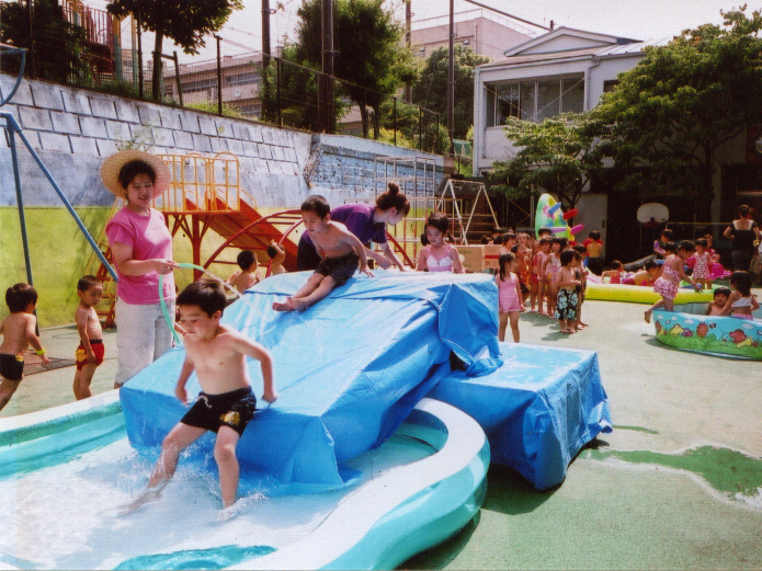 夏休みに入ってからの夏期保育。思いっきり水あそびを楽しみます。目玉は、何といっても先生特製の大型すべり台!その他にも、ミニゲーム、ボディーペインティングなど盛りだくさん。夕方、園庭に机を出して、みんなでカレーをいただきます。これがまた、最高においしいんです!! |